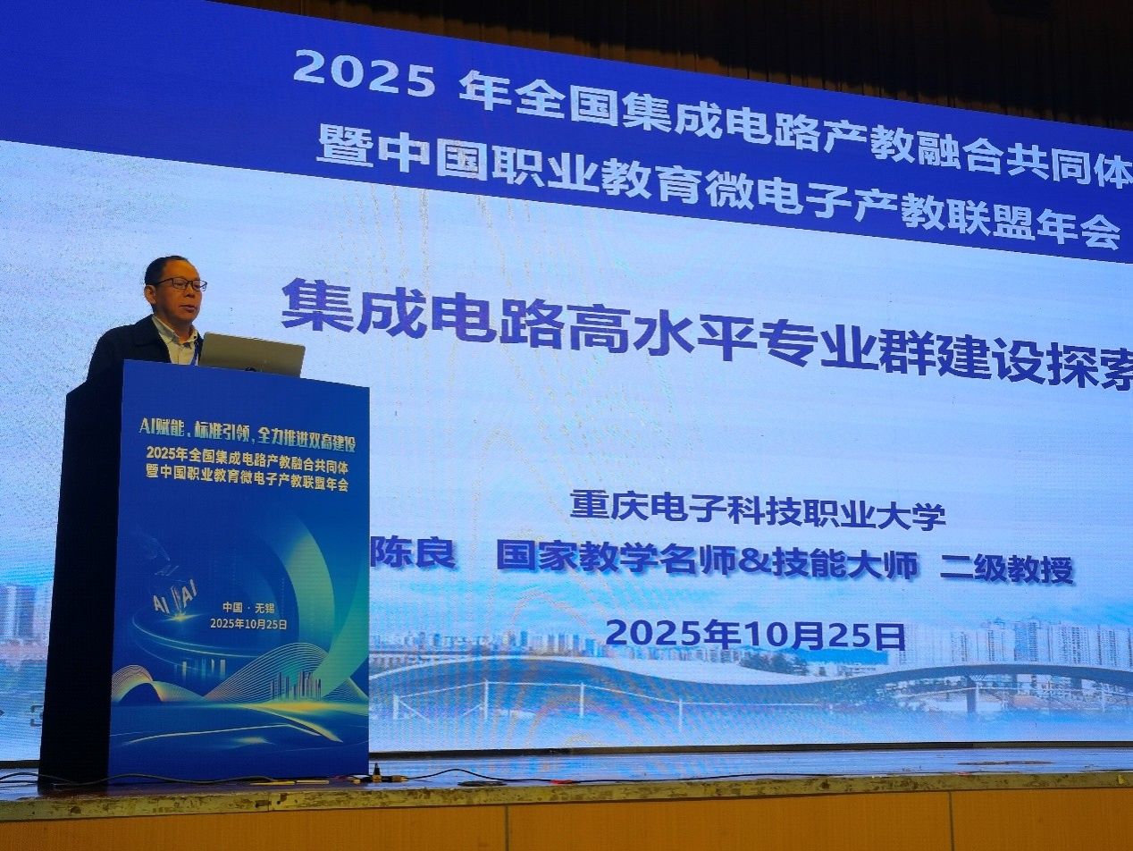2025年10月25日,星空在线登录官网电子与物联网学院(集成电路学院)党总支书记陈良(二级)教授受邀出席在江苏无锡举办的2025年全国集成电路产教融合共同体工作会议暨中国职业教育微电子产教联盟年会,集成电路系副主任林涛教授陪同参会。本次会议以“AI赋能、标准引领,全力推进双高建设”为主题,汇聚了全国30余家企业代表、50余所院校代表,共同探讨集成电路产教融合与高水平专业群建设路径。