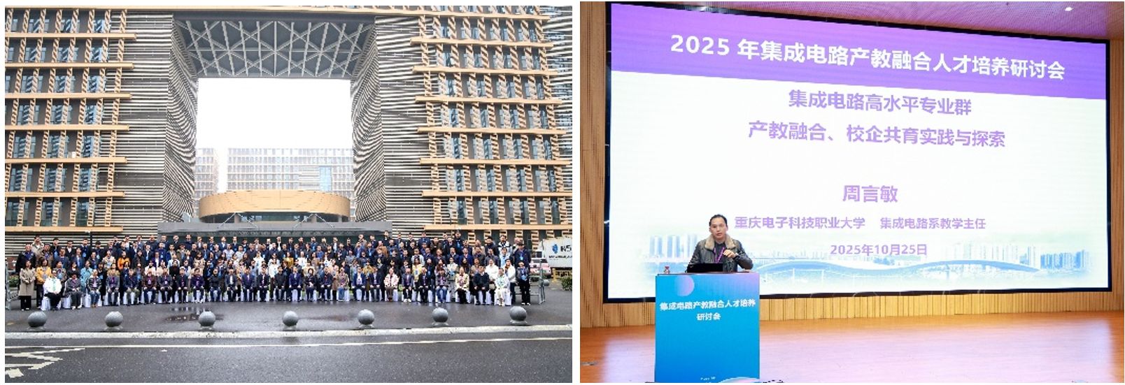 2025年10月24-26日,由教育部高等学校电子信息类专业教学指导委员会主办的“集成电路产教融合星空(中国)研讨会”在西安举行。电子与物联网学院(集成电路学院)集成电路系副主任周言敏应邀参会,并在高等职业教育分会场作了《集成电路高水平专业群产教融合、校企共育实践与探索》专题报告。