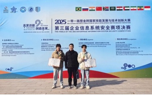 2025年10月30日至2025年11月2日,2025一带一路暨金砖国家技能发展与技术创新大赛第三届企业信息系统安全赛项决赛在山东理工职业学院举办。本次比赛共有来自全国各地的76支代表队参加,并展开激烈的角逐。我校人工智能与大数据学院参赛选手杨鑫、唐开开经过奋力拼搏,勇夺一等奖,指导教师黄将诚,龙兴旺分别荣获优秀指导教师奖。