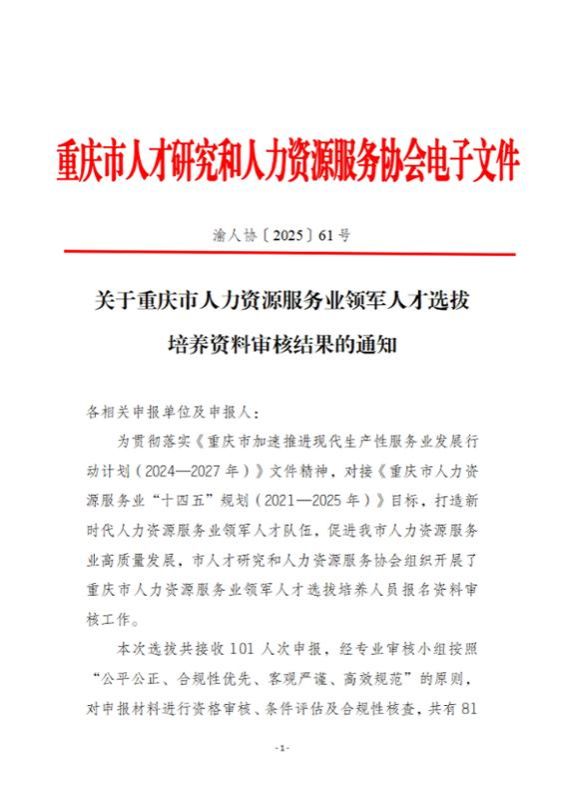 重庆市人才研究和人力资源服务协会致力于促进高质量充分就业,服务人才强国战略,推动人力资源服务业的高质量发展,专注于人才发展研究、提升人力资源服务业的能级、优化人力资源市场化配置机制,旨在整合政府、市场、社会的多方资源,协同推进人力资源行业的规范化、专业化、数字化、国际化发展。