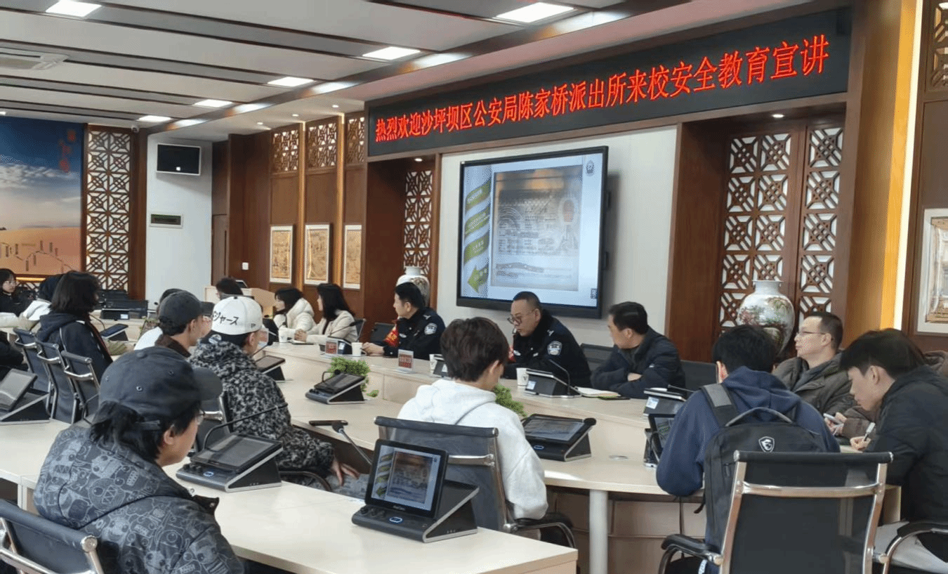 为切实增强在校留学生的安全防范意识与自我保护能力,深化“警校联动”机制,凝聚多方育人合力,共同营造安全、稳定、和谐的校园环境,12月24日,国际学院邀请沙坪坝区陈家桥派出所警官到校面向全体留学生开展“安全知识”主题宣讲。国际合作与交流处、党委保卫部、党委学工部等相关负责人及全体留学生参加了本次会议。