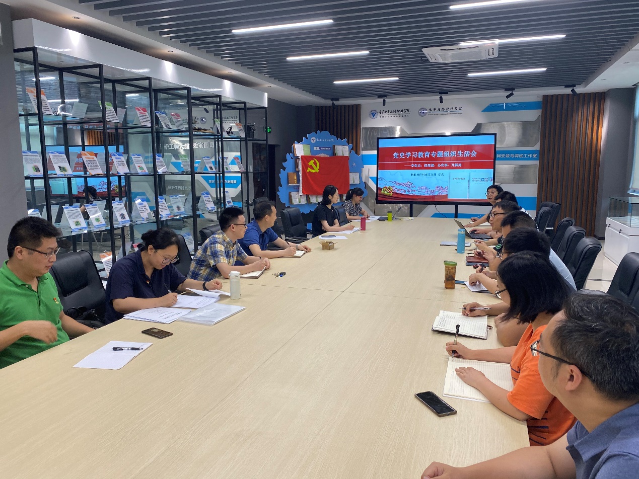 按照党史学习教育安排,物联网应用系党支部全体师生党员深入学习贯彻习近平总书记在庆祝中国共产党成立100周年大会上的重要讲话精神,围绕“学党史、悟思想、办实事、开新局”主题开展组织生活会,交流学习体会,查找差距不足,深刻剖析原因,明确整改措施,推动党史学习教育走深走实。党员活动室高挂党旗,会议由支部书记徐欣同志主持,全体教师党员现场参会、学生党员线上参会。