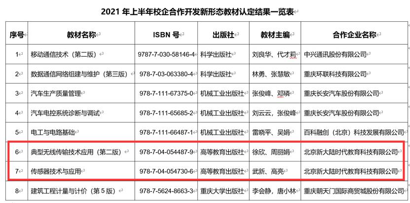 为贯彻《国家职业教育改革实施方案》,落实《职业院校教材管理办法》等相关文件精神,学校不断加强教材建设,突出职业教育的类型特点,统筹推进教师、教材、教法改革,深化产教融合、校企合作,推动校企“双元”合作开发新型活页式、工作手册式教材。经各二级学院申报、专家评审和综合评议,共8本教材认定为校级校企合作开发新形态教材,电子与物联网学院传感网应用开发模块两本教材入选,分别是徐欣、周丽娟等主编的《典型无线传输技术应用(第二版)》,武新、高亮等主编的《传感器技术与应用》。