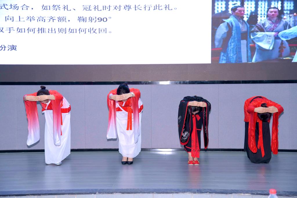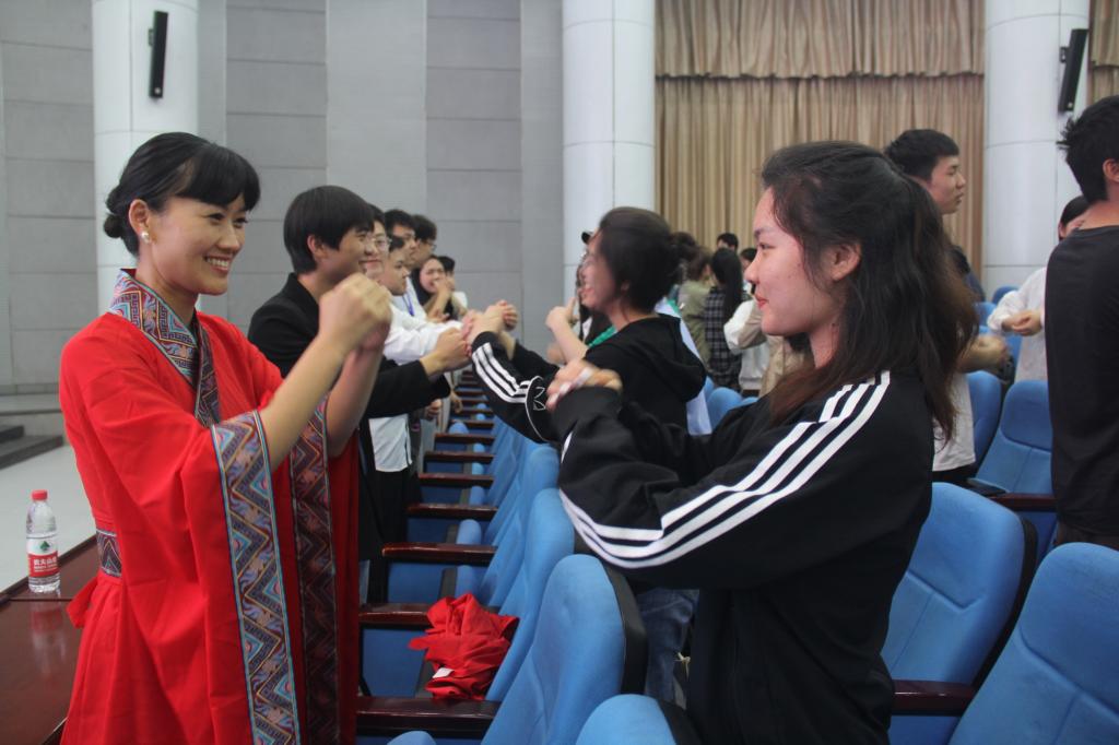 张浩月老师从礼仪的历史起源与发展,讲授了国学礼仪的源远流长。而后通过现场问答、动作示范、场下训练等方式对抱拳礼、拱手礼、揖礼、万福礼等礼仪礼规耐心指导学生实操训练。整个培训过程氛围活跃、形式多样、轻松幽默。最后李亚男老师指导全场参训人员表演手语操《礼》,音乐婉转动听、动作优美大气。