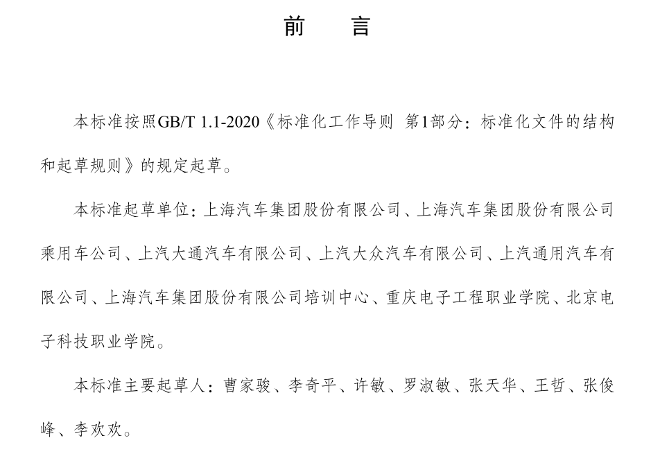 据悉,本次起草的《燃油汽车总装与调试职业技能等级标准(2021年1.0版)》是按照GB/T 1.1-2020《标准化工作导则 第1部分:标准化文件的结构和起草规则》的规定起草,并由上海汽车集团股份有限公司联合5家公司和重庆电子工程职业学院、北京电子科技职业学院2所高校共同制定。本标准规定了燃油汽车总装与调试职业技能等级对应的工作领域、工作任务及职业技能要求。主要适用于燃油汽车总装与调试职业技能培训、考核与评价,相关用人单位的人员聘用、培训与考核可参照使用。