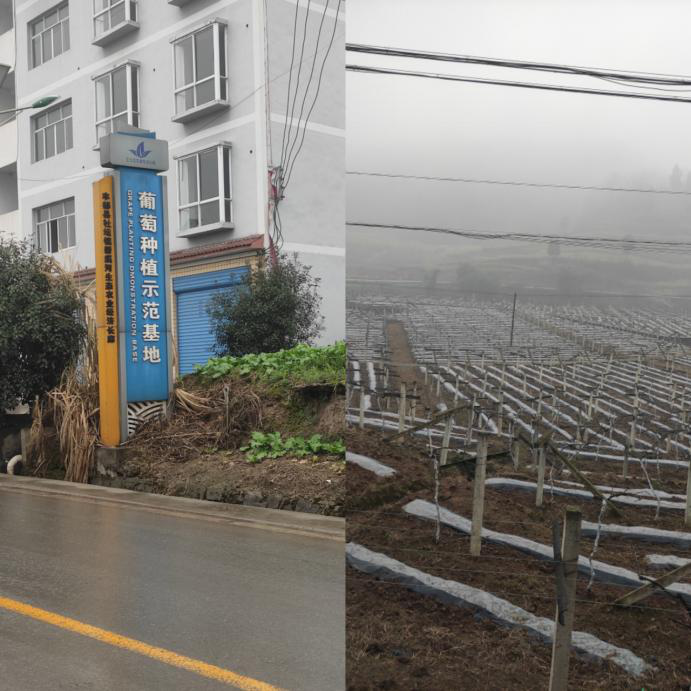 实践团队首先来到丰都县社坛镇永兴村葡萄种植示范基地进行实地调研。通过询问果园负责人进入了解种植基地情况,同时亲身体验果园种植。遗憾的是,因为正值冬季,葡萄果藤处于休眠期,所以看不到丰收采摘的场景。但是做好冬季果藤的维护工作依然重要,当地种植户们给葡萄幼苗覆盖一层塑料膜进行保温,以确保顺利过冬。