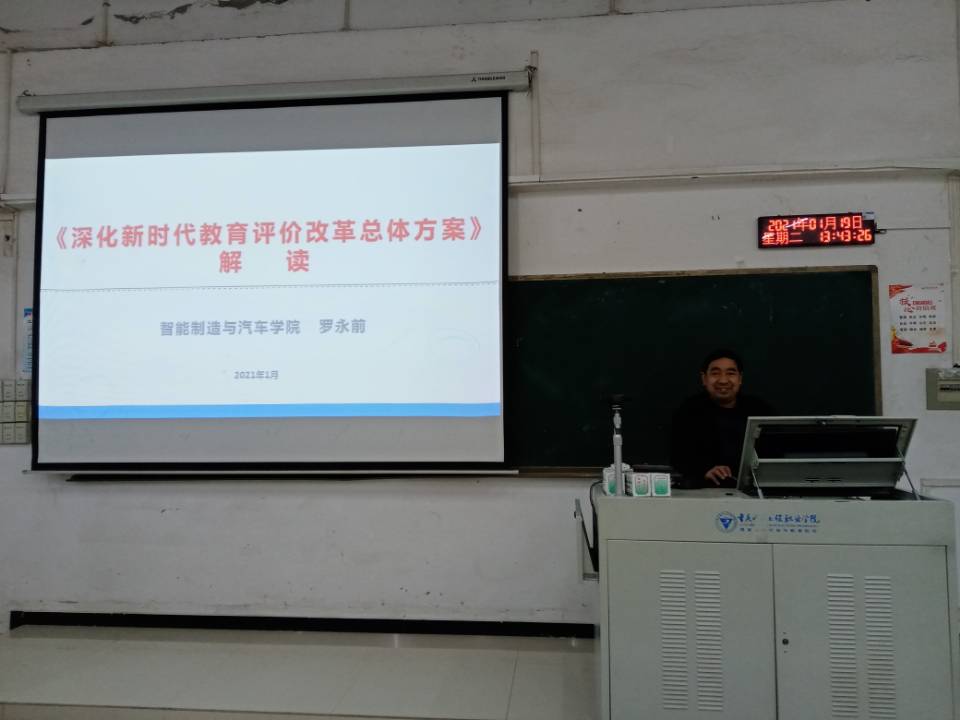 为深入推进学习宣传贯彻《深化新时代教育评价改革总体方案》(以下简称“总体方案”),智能制造与汽车学院组织137名教职工于2021年1月19日在北校区9-212举办了专题培训会。智能制造与汽车学院书记罗永前对《深化新时代教育评价改革总体方案》进行了解读。