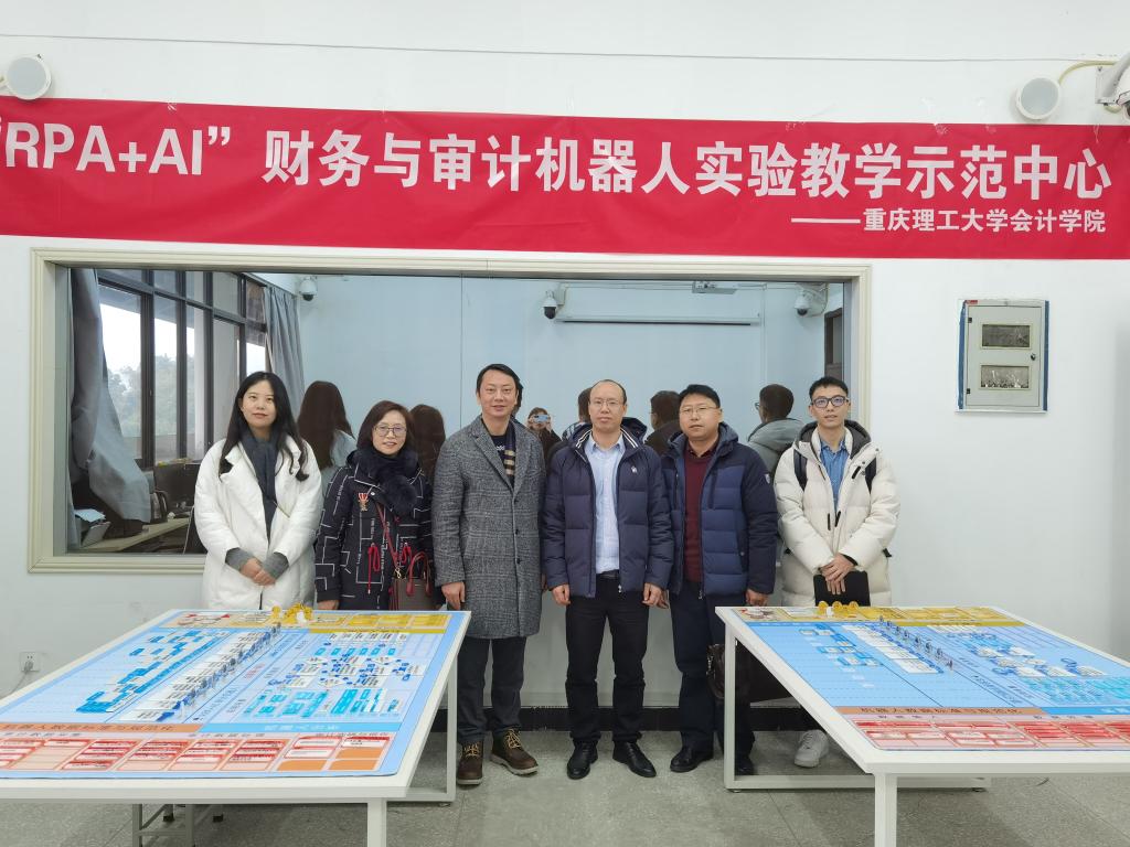 调研团队在重庆理工大学会计学院程平副院长引领下,先后参观了会计学院的财务共享实验教学中心、财务与审计机器人实验室(RPA+AI),了解了有关财务共享实验中心和审计机器人沙盘推演教学开展情况。
