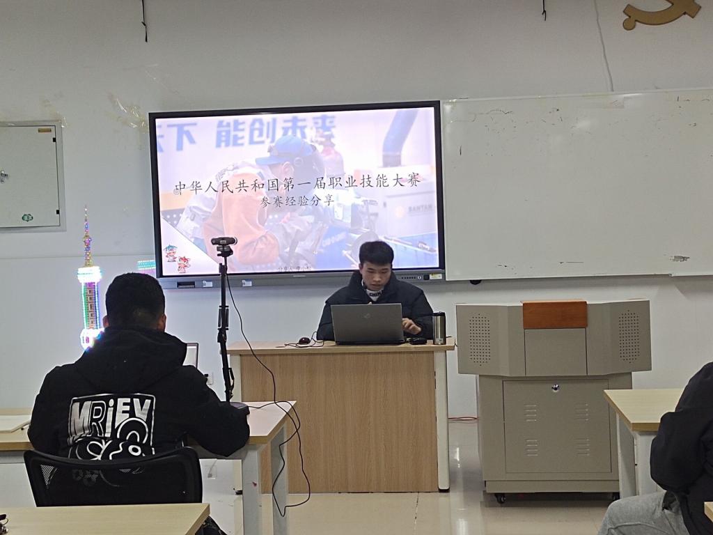 紧接着,获得世赛银牌的选手李小松,为大家分享自己的成长历程和参赛经验。李小松同学通过图片展示了自己在光电技术世界邀请赛时的工位,并说:“现在看来,当时暴露出很多的缺点,我就一直将这张照片保留着,以此提醒自己奋进,刻苦训练技能,提醒自己时刻牢记职业安全意识。”李小松激励大一的学弟学妹们抓住机遇,努力奋斗,不负韶华。