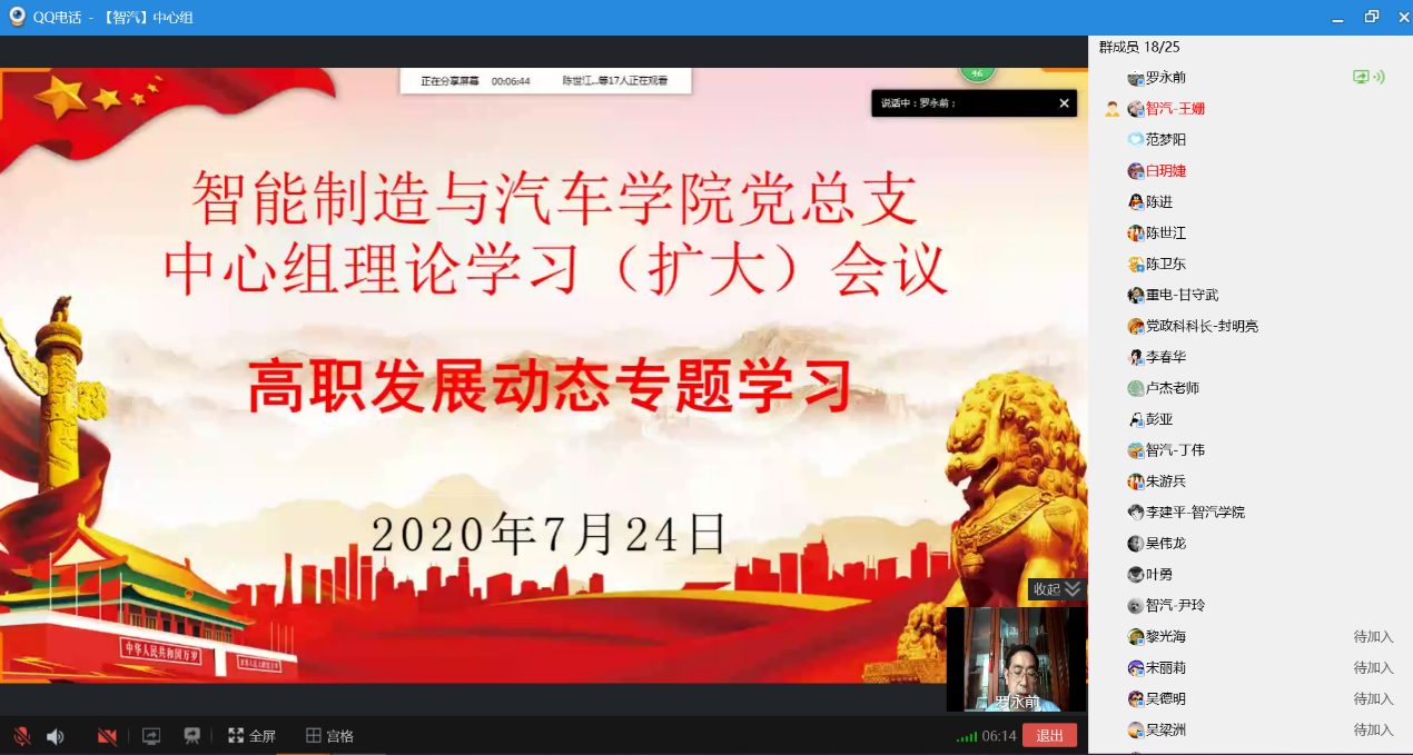 为掌握高职教育前沿动态,落实党中央、国务院、教育部相关工作的部署要求,按照党员干部理论学习常态化机制要求,7月24日下午,智能制造与汽车学院以网络会议的方式,组织开展中心组政治理论学习扩大会议,对高职发展动态进行了专题学习研讨。学院党总支书记罗永前主持会议,学院处科级干部、总支委员、支部书记、系主任、工程中心主任等参加了学习。