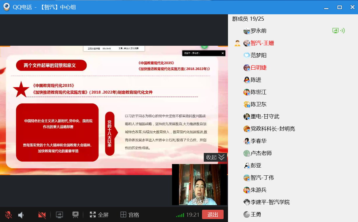首先,罗永前书记领学了中共中央、国务院印发的《中国教育现代化2035》和《加快推进教育现代化实施方案(2018-2022年)》相关文件精神。这两个文件共同构成了教育现代化的顶层设计和行动方案,是我国第一个以教育现代化为主题的近中长期战略规划,是新时代推进教育现代化、建设教育强国的纲领性文件。罗永前书记以文件起草的背景和意义作为切入点,从文件的具体定位、教育现代化的指导思想、基本原则、战略任务等方面对文件中的重点内容进行了准确、详细的解读。随后,罗永前书记带领大家一起学习了《国家职业教育改革实施方案》,从完善职业教育制度体系、构建职业教育标准、如何完善技术技能人才保障等方面对文件内容进行了深入浅出的讲解。