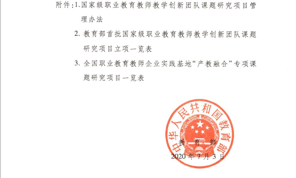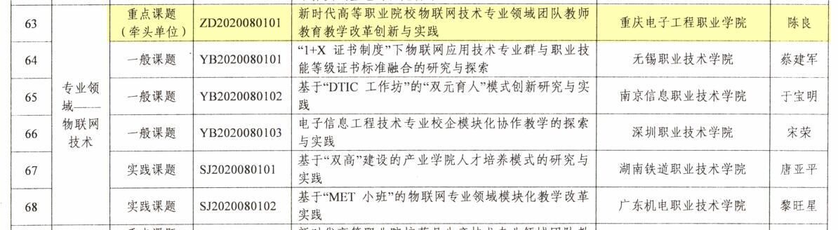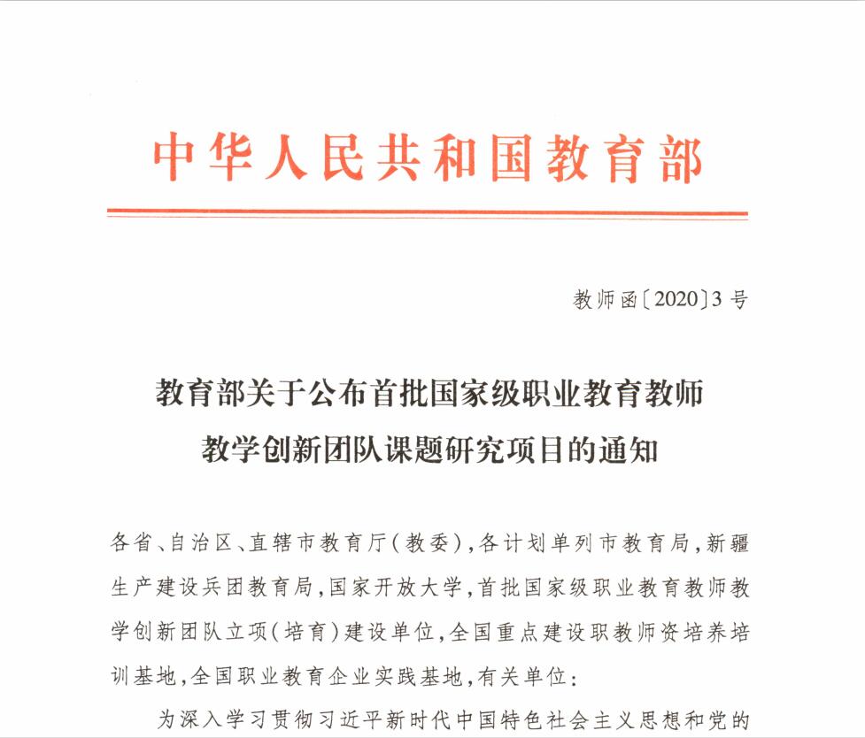 近日,《教育部关于公布首批国家级职业教育教师教学创新团队课题研究项目的通知》(教师函[2020]3号)下发,我院《新时代高等职业院校物联网技术专业领域团队教师教育教学改革创新与实践》成功立项重点课题,并为该领域牵头单位。