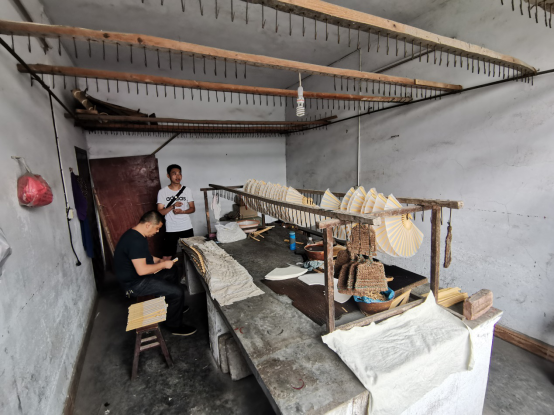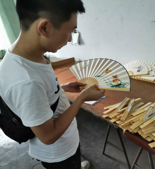 2020年7月10日,在重庆市开州区临江镇街心花园的黄圣科师傅的家庭工坊中,重庆电子工程职业学院智能制造与汽车学院 “三下乡”社会实践活动志愿者们吴帅、刘昊同学上了一堂生动的传统手工艺制扇实践课。