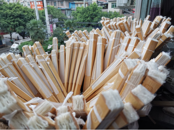 在当地政府部门工作人员的带领下,志愿者们来到了这个以手工制扇而闻名的家庭工坊。当志愿者们到达工坊时,看到了精心装订好的各类扇面骨架、精心熬制的秘制胶水,提前一天准备好的用米浆浸泡好的丝绸……工人们正忙碌着制作香绸扇的准备工作。