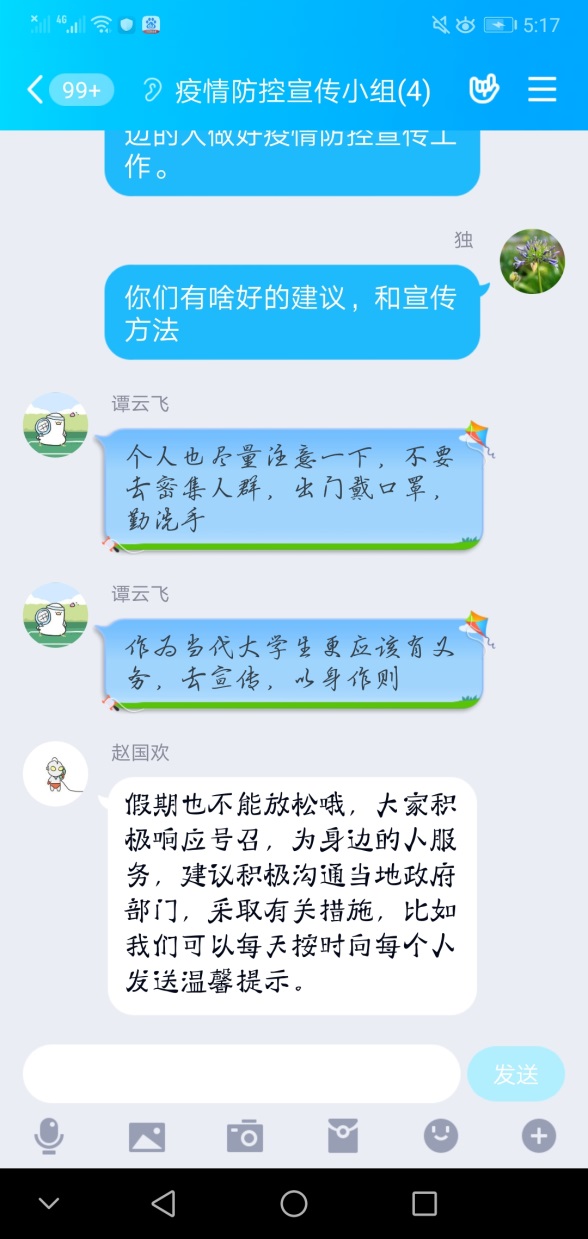 团支部副书记张芮意、生活委员赵国欢等人担任起了温馨小贴士的工作。赵国欢每天早上准时在班级QQ群发布个人防护温馨提示,还私发给每一位同学,提醒同学们做好自身防护第一步,积极响应国家号召,不外出,不聚集,及时上报行程及身体状况,也鼓励同学们坚定信心,正确认识和面对疫情。张芮意每天拂晓就走街串巷发放宣传材料、张贴宣传标语。他们不厌其烦,反复宣传防控措施和注意事项,要求支部成员和身边的人不参加、不举办集体聚餐,不去人员密集的场所等等,守初心暖人心,用行动担使命。