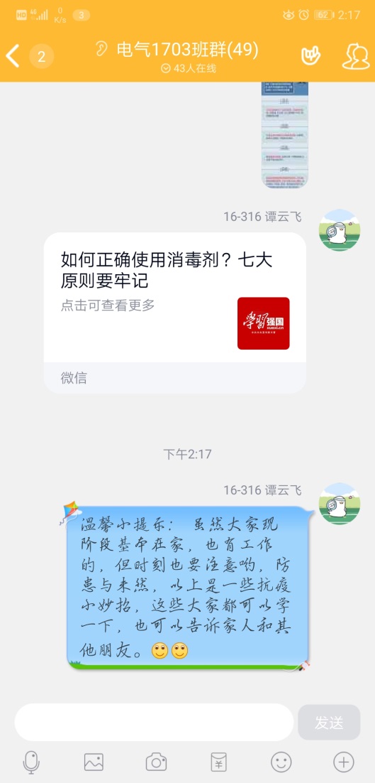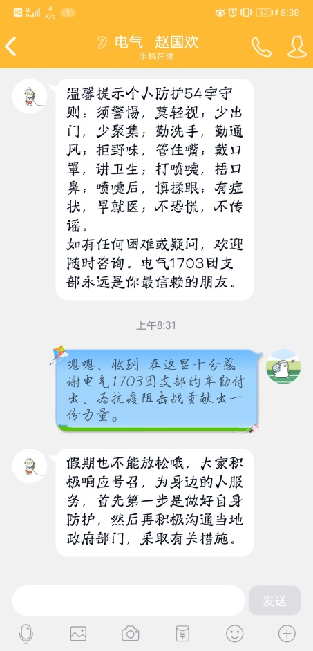疫情防控是一场群众战争,想要打赢这场没有硝烟的战争,要全民参与,群防群治。电气1703班团支部动员支部成员组建了临时防控知识学习小组、宣传小组,通过网络平台和短信提醒为疫情防控工作提供了强有力的组织保障。团支部书记魏绪刚和学习委员谭云飞等学生干部组织通过每日分享学习资料和防控措施,缓解同学们的情绪,不为疫情阻击战添堵、添乱。在大家的共同努力下均取得了较好的成果,电气1703班团支部始终坚信,胜利必然属于我们!