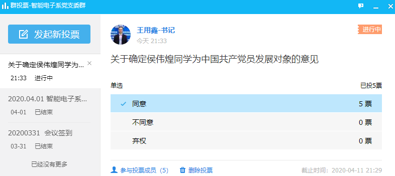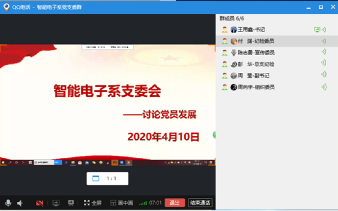 2020年04月10日电子与物联网学院智能电子系党支部支委会通过在线会议的方式讨论并确定了支部“抗疫”志愿者入党积极分子候伟煌为发展对象。