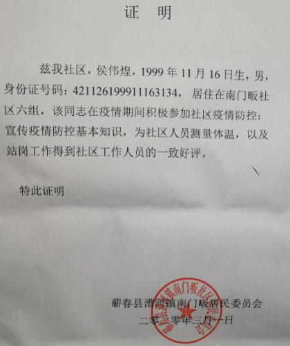 候伟煌同学居住在蕲春县漕河镇南门畈社区六组,蕲春县位于湖北省东南部,隶属黄冈市,处于新冠疫情的暴风眼中。在这场没有硝烟的战斗中面对新冠病毒这个看不见的“敌人”,候伟煌同学响应党的号召主动行动起来,积极参与社区一线的疫情防控工作,宣传疫情防控基本知识,为社区人员测量体温,排查发热人群,在站岗工作中参与返乡人员的设卡摸排,出色地完成了防控工作并得到社区工作人员的一致好评。
