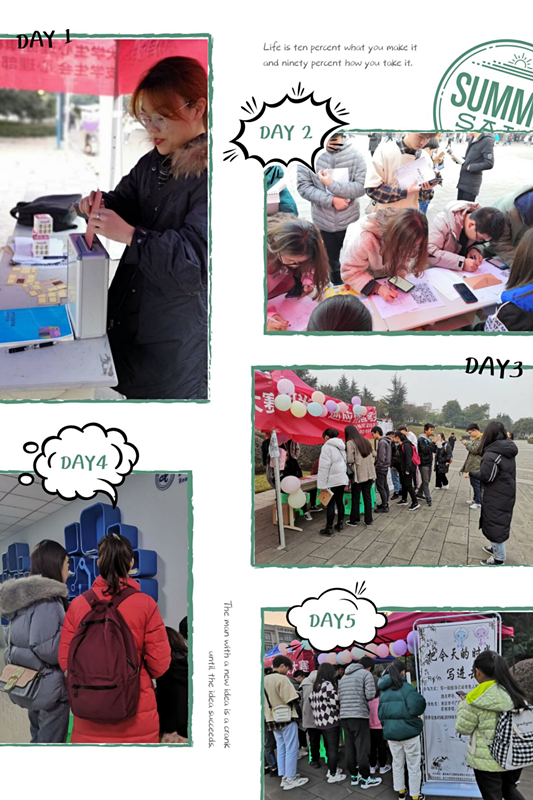 此处活动以促进人与人之间的沟通、交流为主题,概念较为广泛,服务对象为全校同学。参与此次活动的每位同学,可免费获得精美信封、邮票、明信片,给自己或家人、老师、朋友写一些暖暖的文字,并登记好个人信息和收信人的地址与联系方式,电子与物联网学院心理部的工作人员就会帮你把这封信送出或寄出。缩短空间上的距离,让爱不再遥远;活动开始后,现场人头攒动,大家奋笔疾书,将自己的思念之情化作了工工整整的文字。相信这些饱含深情的书信一定会给身处异城的朋友们带来惊喜。