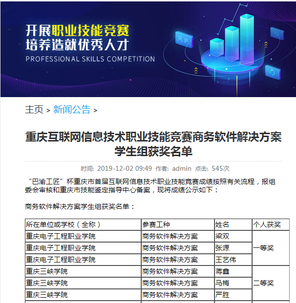 2019“巴渝工匠杯”重庆首届互联网信息技术职业技能竞赛获奖名单节选,网址链接:http://bygj.cqdirect.net/tzgg/21.html