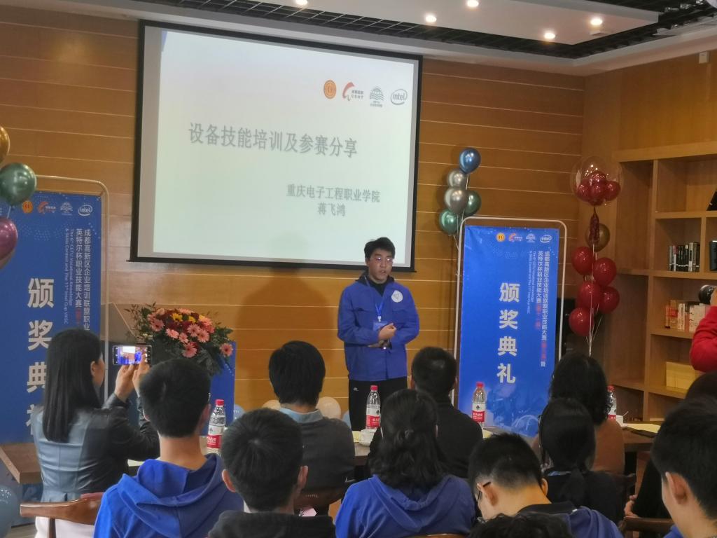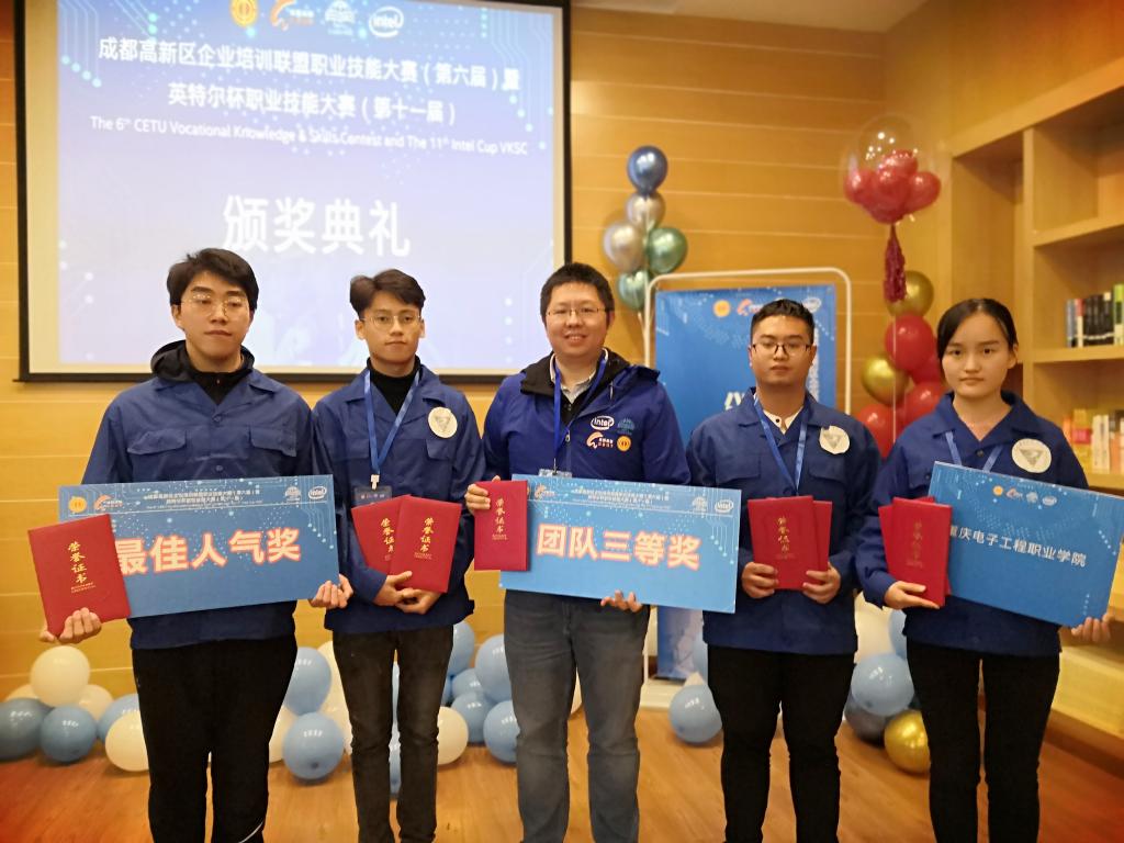 2019年11月8日,由英特尔公司、成都高新区企业联盟主办的“英特尔杯职业技能大赛(第十一届)暨成都高新区企业培训联盟职业技能大赛(第六届)”在成都举行,来自四川、重庆等地的多所高职院校在校学生和来自京东方、天马微电子等企业的企业员工同场竞技。电子与物联网学院刘睿强、马岗强老师指导的蒋飞鸿、王敏、周胜、罗艺学生代表队荣获团队三等奖、最佳人气奖。