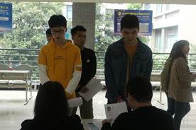 首先,严世同给志愿者开展了动员会,他指出志愿者代表着学院的形象,在工作中要认真勤奋,要拿出精气神儿去面对一天的工作。谨记严世同同志的寄语,志愿者开始了他们一系列的准备工作,一切就绪后,各企业负责人陆续到场,双选会工作随即展开。