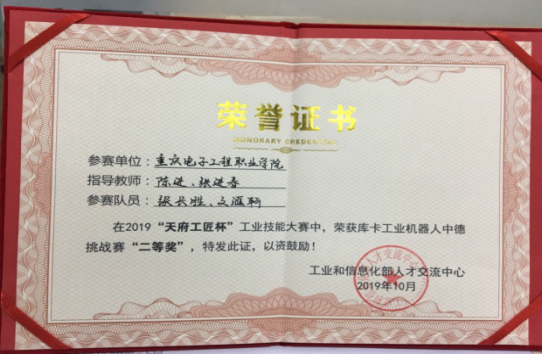 此次工匠技能大赛分为“机械综合加工中德挑战赛”“库卡工业机器人中德挑战赛”“工业产品创新设计与增减材制造挑战赛”“数字双胞胎挑战赛”“48小时国际尖兵挑战赛”。本次大赛由教师张进春和陈进指导的学生张长胜、文滙轲获“库卡工业机器人中德挑战赛”二等奖;教师卢杰和肖含月指导的学生任晓羽获“工业产品创新设计与增减材制造挑战赛”二等奖。