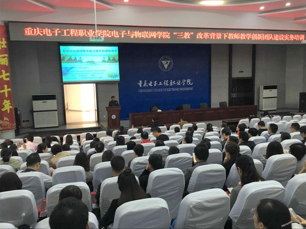 2019年10月19日-20日,电子与物联网学院特别邀请了全国职业教育专家、全国十佳科研工作者杨克教授为全校教师做“全国职业院校‘三教’改革背景下教师教学创新团队建设实务培训”,培训班在博远厅举行,电子与物联网学院、人工智能与大数据学院、建筑与材料学院、通信工程学院、智能制造与汽车学院,数字媒体学院以及重庆市万盛职业教育中心等200余人参培。