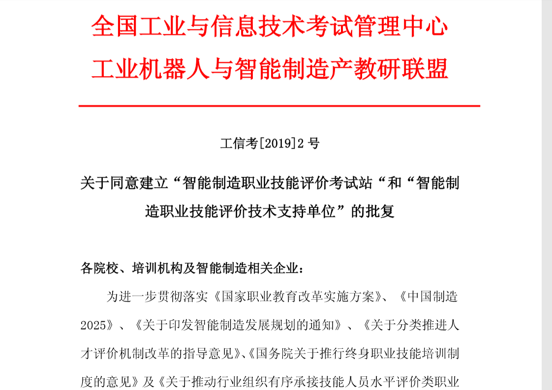 全国工业与信息技术考试管理中心、工业机器人与智能制造产教研联盟于2019年9月25日联合发文《关于同意建立“智能制造职业技能评价考试站”和“智能制造职业技能评价技术支持单位”的批复》(工信考[2019]2号),同意155家院校和培训机构为“智能制造职业技能评价考试站”、66家企业为智能制造职业技能评价技术支持单位。