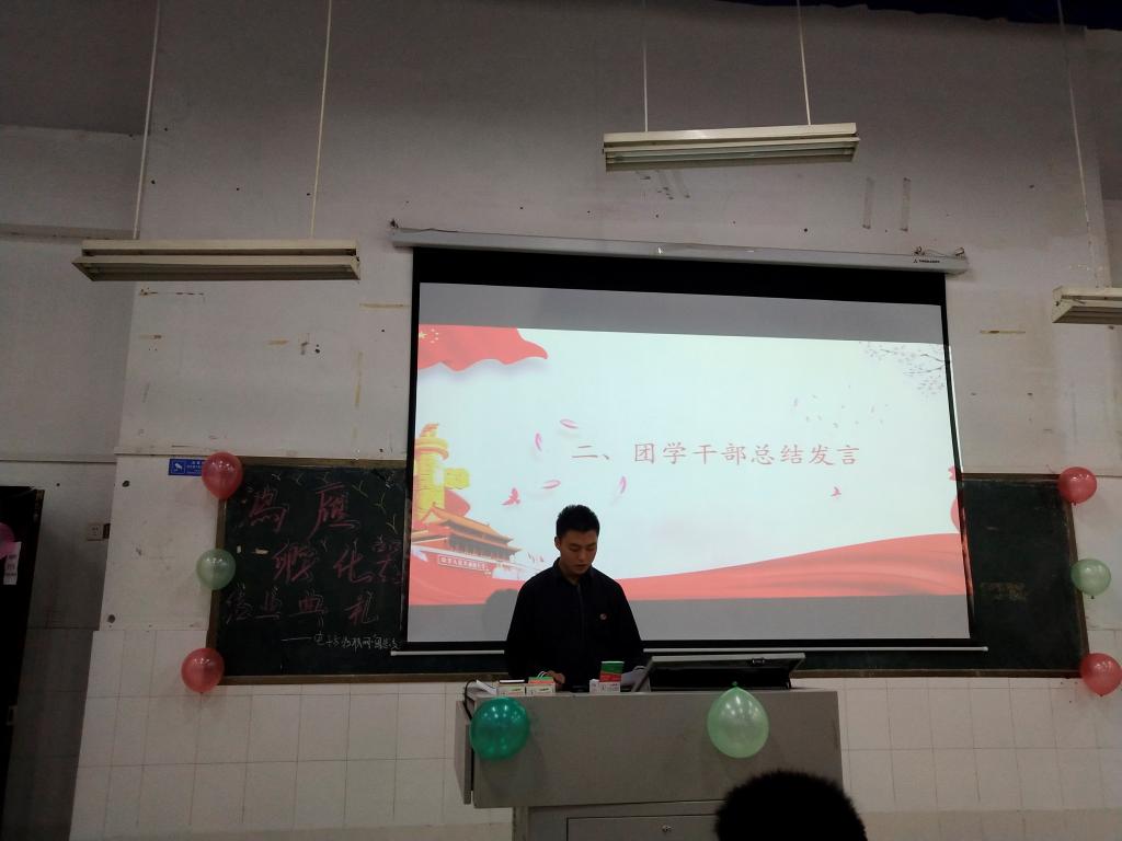 典礼第三项电子与物联网学院团总支书记聂浩虹发言,聂浩虹老师首先对顺利结业的同学表示了祝贺,然后告诉了我们鸿雁飞了五个月,“坚持”二字本身才是最重要的一项考察,若连这五个月的空虚寂寞都受不了,那团总支怎么放心将未来一年的重担压在大家身上?很高兴我们大部分的同学还是坚持下来了。鸿雁在今天结业了,新的一批的干部也将在最近走上自己的新岗位,希望你们能够团结一致、奋勇向前,为我们的事业,为我们自己的荣誉,忘我奋斗。