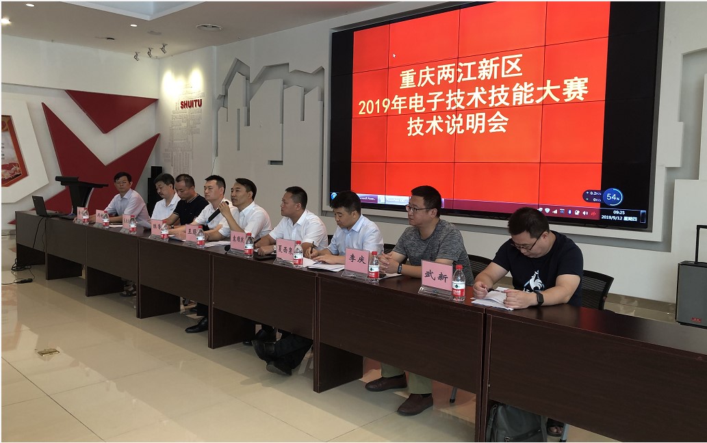 2019年9月12日,应重庆两江新区管委会邀请,由电子与物联网学院夏西泉副院长带队,毛朝庆、唐云、武新、周彬、李庆五位赛项负责老师组成的技术支持团队到重庆两江新区水土园区党群服务中心会议室,参加了重庆两江新区2019年电子技术技能大赛技术说明会。