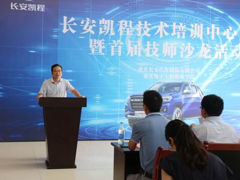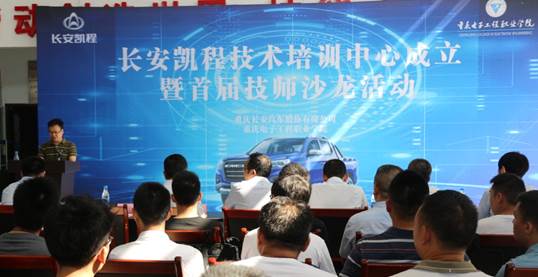 2019年8月15日上午10时,长安凯程技术培训中心成立揭牌仪式及首届技师沙龙活动在我校举行。参会的领导及嘉宾有长安汽车股份有限公司人力资源部副总经理王武生、长安汽车轻型车事业部经营管理部总监戴毓韬、长安汽车轻型车事业部保定长安客车制造有限公司市场营销部副总监李斌,学校副校长刘成俊、培训与继续教育中心主任陈志军、智能制造与汽车学院院长张进春、副院长叶勇,长安凯程技术工程室主任师建强、长安凯程西部战区副总经理李贺。授牌仪式及首届技师沙龙活动由智能制造与汽车学院李蕊老师主持。