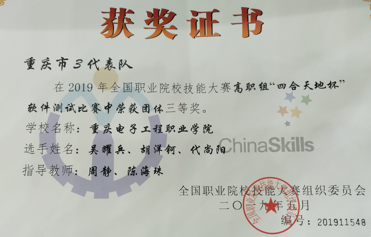 5月30日上午,2019年第十二届全国职业院校技能大赛高职组“软件测试”赛项在西安航空职业技术学院落下帷幕。于由我校周静、陈海珠老师指导的吴耀兵、胡洋钶、代尚阳三位同学组成的参赛队,经过激烈角逐,获得该赛项的三等奖。