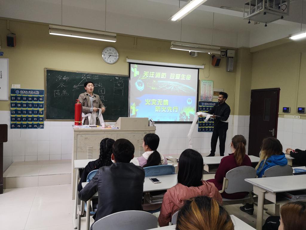 首先,安全保卫处熊浩然老师给留学生们做了“关注消防 珍爱生命”的消防安全讲座,以图文并茂、事故分析、现场说法等方式,讲解了学校的消防安全实际情况,结合在工作和生活中用电、用气、用火的知识,介绍了事故发生的原由及所造成的危害情况,重点讲解了报警、灭火器的正确使用方法,火场逃生、自救、互救等方面的急救措施等内容。随后,进行了留学生公寓紧急情况疏散演练和消防灭火演练,留学生们正确使用灭火设备进行灭火操作,通过此次教育培训,提高了我校留学生消防安全意识,增强了每位留学生预防处置校园火灾事故的自防、自救能力。