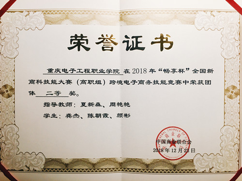 12月23日,2018年“畅享杯”全国新商科技能大赛(高职组)跨境电子商务技能竞赛全国总决赛在天津落下帷幕。大赛由中国商业联合会主办,天津轻工职业技术学院和中教畅享(北京)科技有限公司联合承办,来自全国各地的66所院校参赛队经过4个小时的激烈比拼,一决高下。最终,在夏新森、周艳艳两位老师的指导下,电子与物联网学院电子产品营销与服务专业2017级的龚杰、颜彬、陈朝霞三位同学荣获团体二等奖。