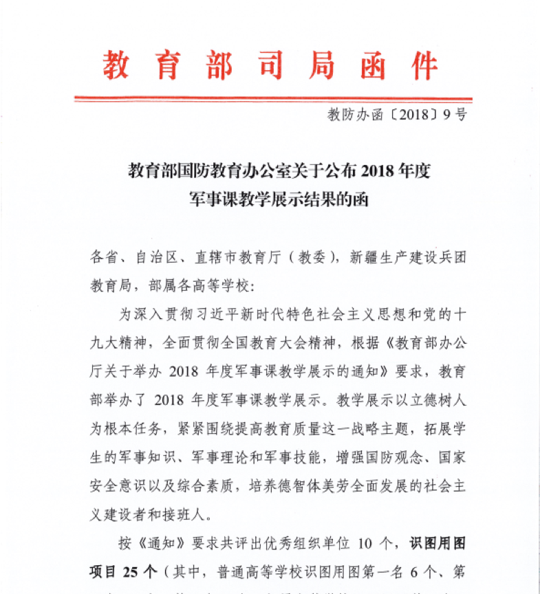 2018年 12月24日,教育部公布了2018年度军事课教学展示活动结果,我校智慧健康学院和校武装部联合组队的机器人项目,在众多展示项目中脱颖而出,荣获普通高校组第二名的优异成绩。