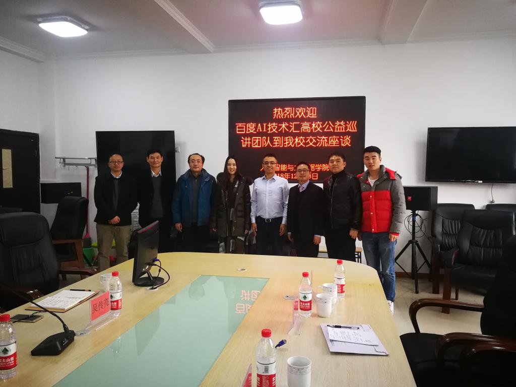 2018年12月18日上午,百度AI技术汇高校公益巡讲团队到我校召开了人工智能领域的校企合作交流座谈会。本次座谈会由我院朱堂勋老师主持,童世华副院长、刘宏宇书记、胡云冰老师、邓剑勋老师、百度校园品牌部经理马天野女士、国信蓝桥CT0张亮先生等参会交流。