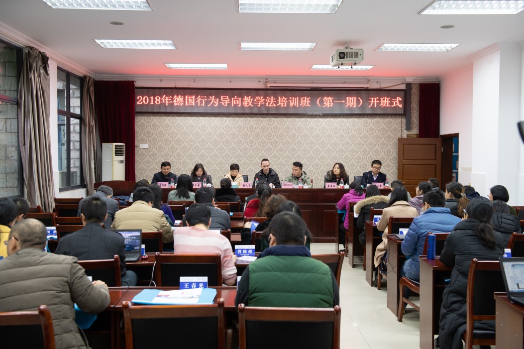12月10日上午,由德国南图林根州手工业协会主办,北京德信合力教育科技有限公司承办,我校国培基地协办的“2018年德国行为导向教学法培训班(第一期)”开班式在1-101室举行。德国南图林根州手工业协会培训部主任Sandro Dressel(森多夫.德雷塞尔),北京德信合力教育科技有限公司李杏丽副总经理李杏丽;副校长谢义华,人力资源处处长廖世萍,国际交流与合作发展处处长莫绍强,培训与继续教育中心主任陈志军;以及来自我校的41名骨干教师参加了开班式。开班式由莫绍强主持。