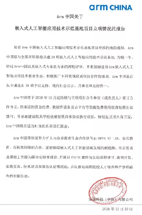 依据Arm中国嵌入式人工智能应用技术示范基地项目申报指南的通知,Arm中国拟与全国高职院校共建20所嵌入式人工智能应用技术示范基地,为期一年。经过Arm中国以及嵌入式专家组专家的两轮评审, 本着鼓励建设Arm嵌入式人工智能应用技术教育生态,积极推广不同领域院系项目合作的原则,Arm中国最后从中遴选出38项予以支持,我院人工智能系胡云冰老师带领教师团队,申报的人工智能技术项目,获得立项。