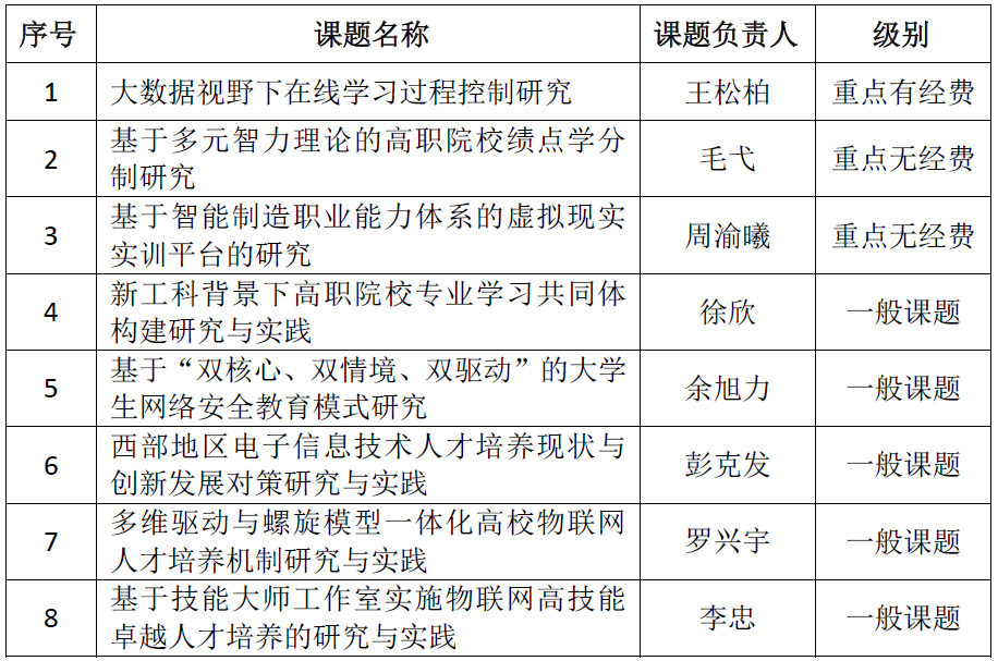 近日,接市教委通知,经申报、评审、审定、公示,电子与物联网学院在2018年度重庆市教育科学“十三五”规划项目申报中成功立项8项,其中重点课题3项,一般课题5项。立项名单如下: