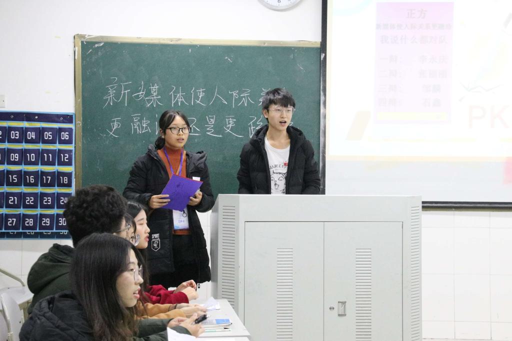 本次比赛先通过自由组队,然后抽签分组,最后进行3场比拼,竞选出优胜队伍。比赛论点分别为“新媒体使人际关系更融洽vs新媒体使人际关系更疏远”、“理性思考重要vs感性体悟重要”和“情在理先vs理在情先”。辩论赛不仅是一场语言的较量,更是一场心理素质的博弈。比赛刚拉开序幕,同学们就全身心投入,紧张的与队友协商战略,拿出必胜的决心全力准备。在整个比赛过程中,每位辩手都条理清晰的表达自己的观点,落落大方、侃侃而谈。对阵双方据理力争,让比赛气氛变得异常激烈,观众的情绪也在选手们唇枪舌剑的辩论中逐渐高涨。最终,三支辩论队首战告捷。