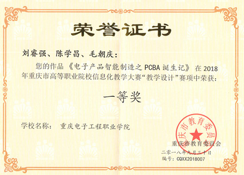 2018年9月12日由重庆市教育委员会主办,重庆工业职业技术学院承办的重庆市高等职业院校信息化教学大赛在重庆工业职业技术学院顺利举行。我校电子与物联网学院刘睿强、陈学昌、毛朝庆老师组成的代表队在本次大赛中荣获一等奖。