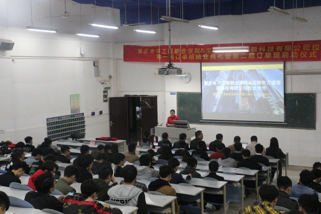 2018年10月25日,建筑与材料学院师生同深圳市万睿科技有限公司(简称“万睿公司”)代表在7-205教室举行了重庆电子工程职业学院建筑与材料学院同深圳市万睿智能科技有限公司校企合作第一期订单班结业典礼暨第二期订单班启动仪式。深圳市万睿科技有限公司重庆城市经理袁镒溅,客户经理何历书,工程经理蒋礼同建筑与材料学院党总支书记严世同、院长周国清教授、教师代表朱承教授等出席了此次活动,本次活动由学院辅导员叶灵艳老师主持。