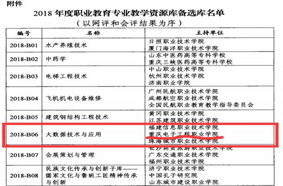 近日,教育部下发《关于公布2018年度职业教育专业教学资源备选库的通知》(教职成司函【2018】121号),我校大数据技术与应用专业成功入选国家级职业教育专业教学资源库备选库!