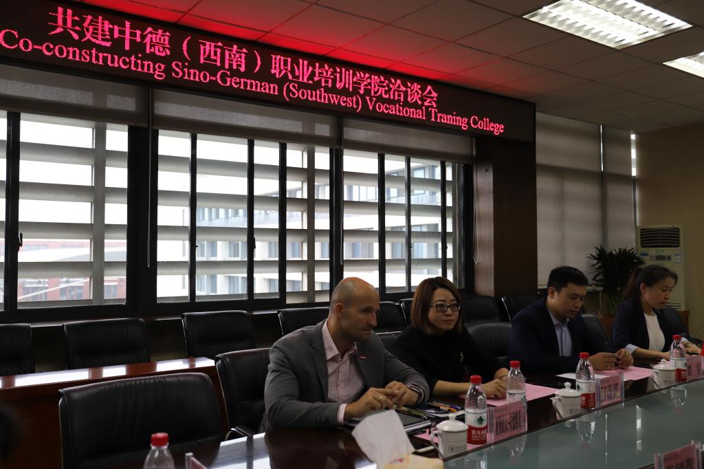 接着在行政楼会议室举行了共建中德(西南)职业培训学院洽谈会。会议由国际交流与合作发展处处长莫绍强主持,我校刘成俊副校长、龚小勇副校长等领导一行出席了会议和签约仪式。
