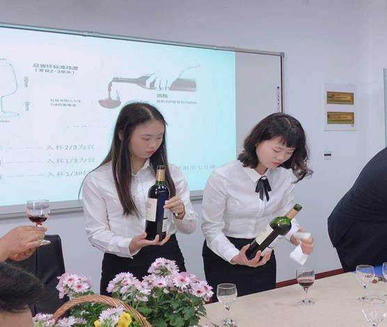 课堂生动地向学生们讲解了红酒礼仪的相关知识,并以演化式教学方式为主导,学生们在企业指导教师的一一示范下边学习边操作,气氛热烈。