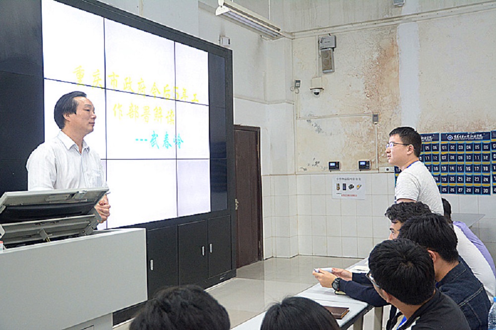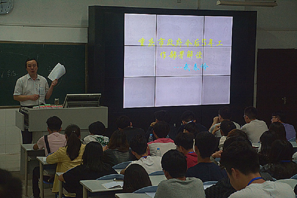 武春岭教授与大家分享了他对《重庆市人民政府工作报告》的学习体会。带同学们重点学习了重庆的发展目标和定位,让同学们了解到:重庆是西部大开发的重要战略支点,处在“一带一路”和长江经济带的联结点上,今后五年,重庆将深入贯彻党的十九大精神,深学笃用习近平新时代中国特色社会主义思想,紧紧围绕习近平总书记对重庆提出的“两点”、“两地”定位和“四个扎实”要求,坚持和加强党的领导,把党的十九大精神和习近平总书记的殷殷嘱托全面落实在重庆大地上。
