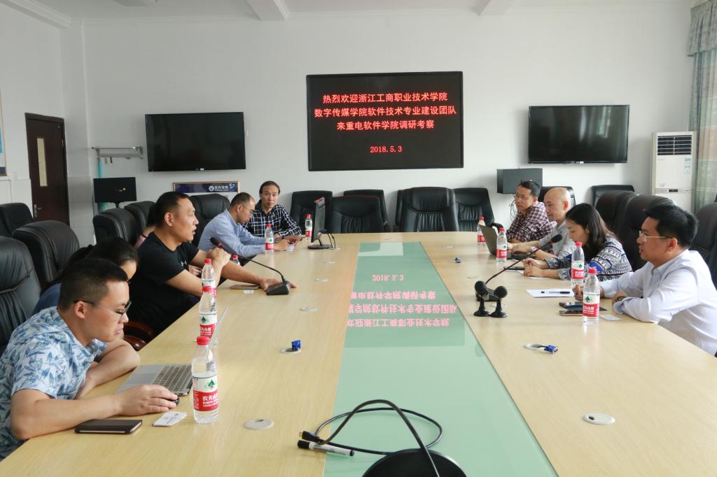 2018年5月3日上午,浙江工商职业技术学院数字传媒学院软件技术专业建设团队韦存存等一行四人来我院交流考察,软件学院党总支书记王文携部分专业教师出席了座谈会。