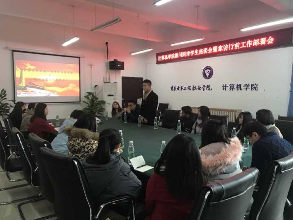 为深入贯彻落实十九大提出的动员全党全国全社会力量,坚持精准扶贫、精准脱贫的精神,不让教育扶贫成精准扶贫的“软肋”,在寒假和新春佳节即将来临之际,为了让经济困难学生过上一个欢乐、祥和的春节,计算机学院结合学院学生实际情况,计划分两条路线对重庆籍建档立卡贫困家庭学生和家庭经济困难学生进行走访。2018年1月17日中午,学院在1110会议室召开“计算机学院寒假慰问困难学生座谈会暨家访行前工作部署会”,学院党总支副书记刘宏宇,团总支书记范可佳,学院所有辅导员、班主任,家庭经济困难学生代表等,共20余人参加。