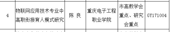 近日,重庆市高等职业技术教育研究会公布了2017年“十三五”高等职业教育科学研究规划课题立项结果。重庆电子工程职业学院物联网学院院长陈良教授牵头主持申报的“物联网应用技术专业中高职衔接育人模式研究”课题获市高教学会、重庆市高等职业技术教育研究会重点立项。